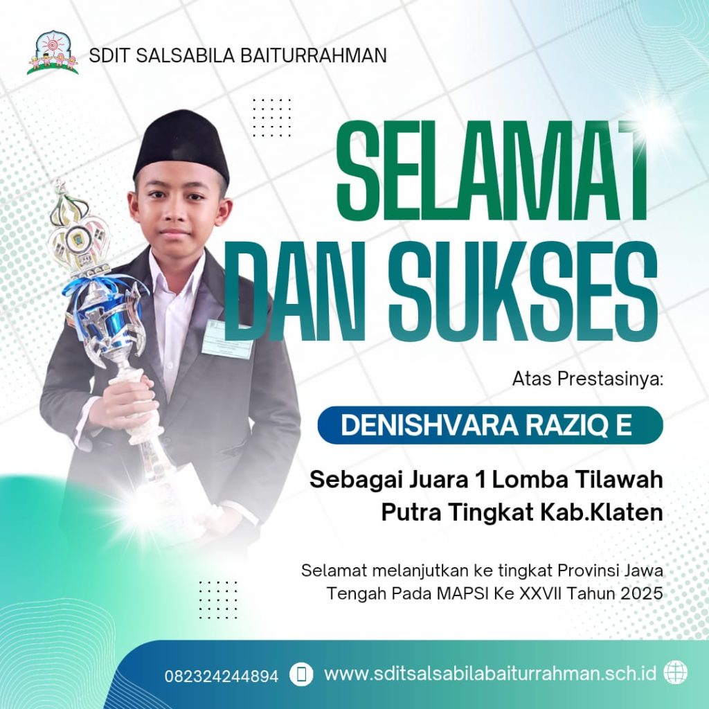 Alhamdulillah dan Selamat kepada Ananda Denishvara Raziq El Hanan Kelas 6C sebagai juara 1 Tilawah Putra MAPSI tingkat Kab. Klaten yang dilaksanakan oleh Dinas Pendidikan Kab. Klaten pada hai Sabtu, 2 Agustus 2025 di komplek SDIT Al Hidayah Ngawen Klaten. Semoga semakin sukses kedepannya. Mohon do’a restu untuk melanjutkan ke tingkat Provinsi Jawa Tengah.